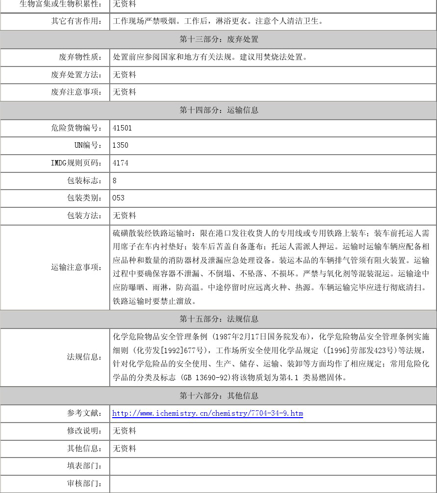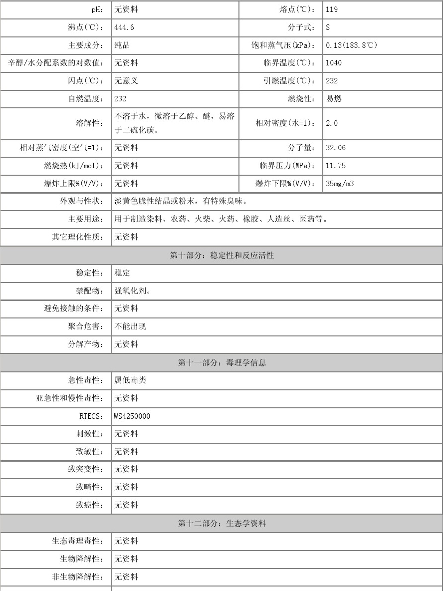 物化性質(zhì):性狀 粉狀硫黃為淡黃色粉末。熔點112.8℃沸點444.6℃相對密度2.07溶解性 易溶于二硫化碳,不溶于水,略溶于乙醇和醚類。